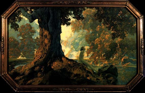 Perhaps the most popular way to unite morality and female sexuality - and in so doing create female beauty - is to place a nude female figure into a natural setting, as Mаxfіеld Pаrrіsh has done above in Dreaming.
