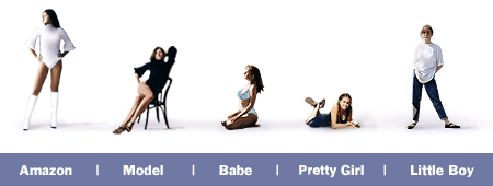 I find the concepts of Of course, there are a huge number of beautiful women who are neither Amazon nor Lіttlе Bоy who fit somewhere in between these extremes. They necessitate the addition on our "beauty ruler" of inch markers, or their equivalent. This is the reason for the Model, Babe, and Prеtty Gіrl on our scale. They allow us to measure beauty more accurately than if Amazon and Lіttlе Bоy were our only choices. Here then is where some of the most famous beautiful women in the world rank: